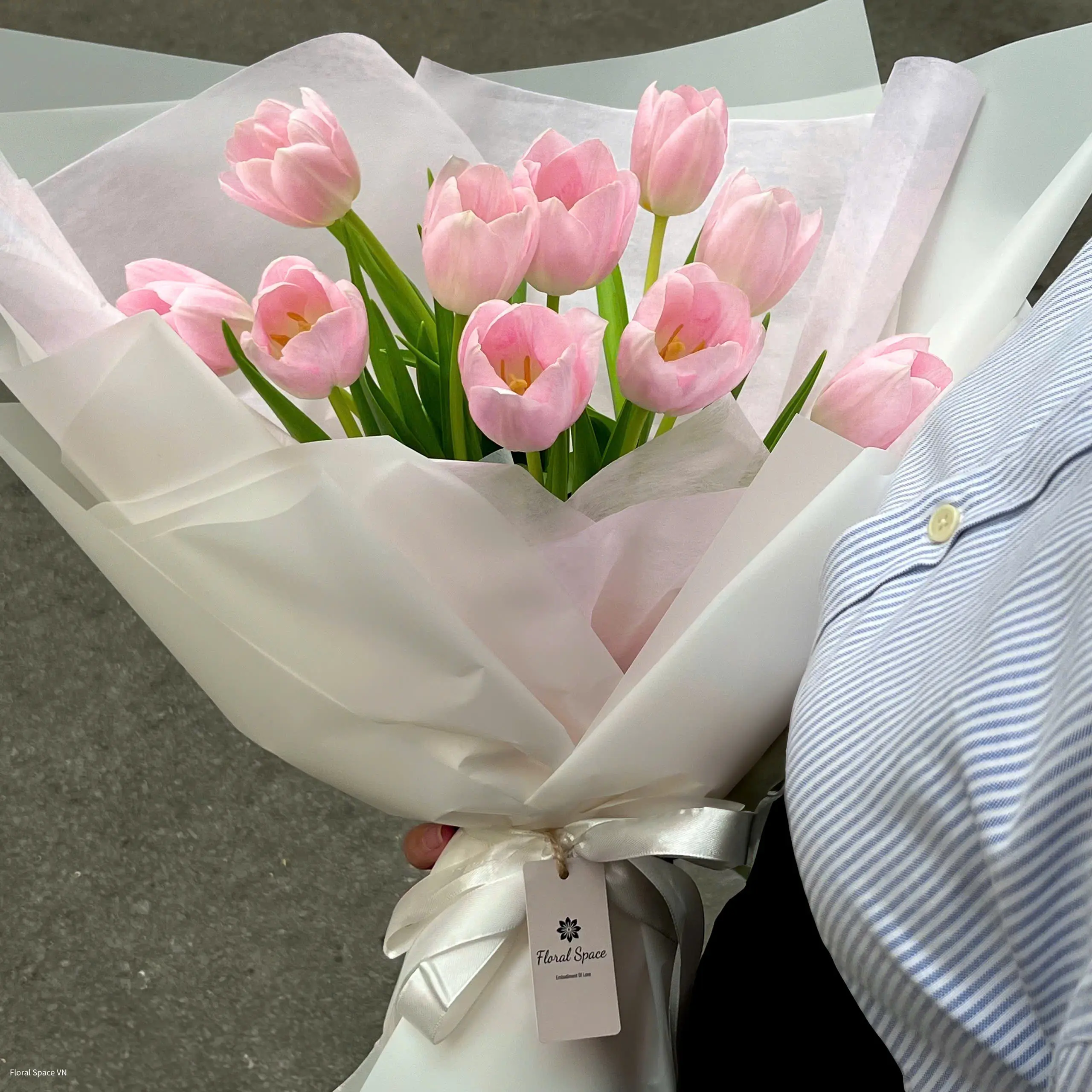 Tulip hồng nhạt mang ý nghĩa trân trọng và hạnh phúc nhẹ nhàng. Gói giấy trắng tối giản càng tôn lên vẻ thanh lịch, tinh khôi.